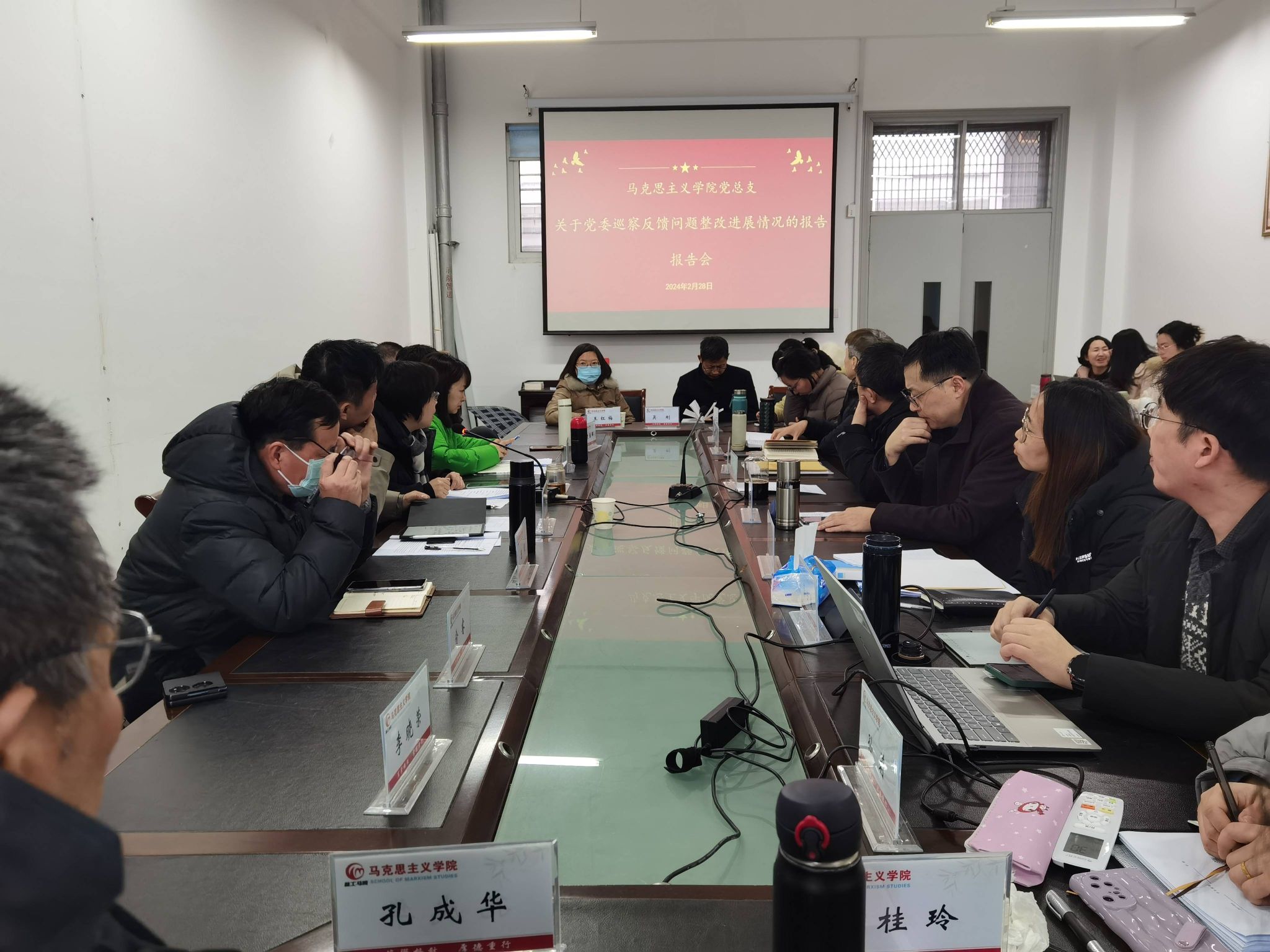 2月28日下午,马克思主义学院党总支在博学楼A514会议室召开巡察整改情况通报会。会议由学院党总支书记包雅玮主持,学院全体教师参加会议。