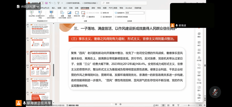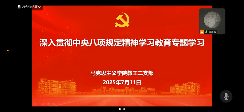 7月11日晚上,马克思主义学院教工第二党支部在线上通过腾讯会议开展深入贯彻中央八项规定精神学习教育专题党课。党支部书记郁海波带领支部党员学习《党的十八大以来深入贯彻中央八项规定精神的成效和经验》。