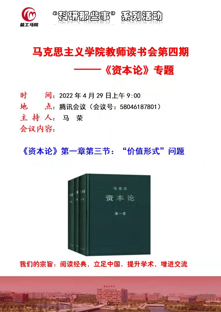 4月29日上午,马克思主义学院举办第四期《资本论》专题读书交流会。院长助理马荣主持,三十余名老师线上参加会议。