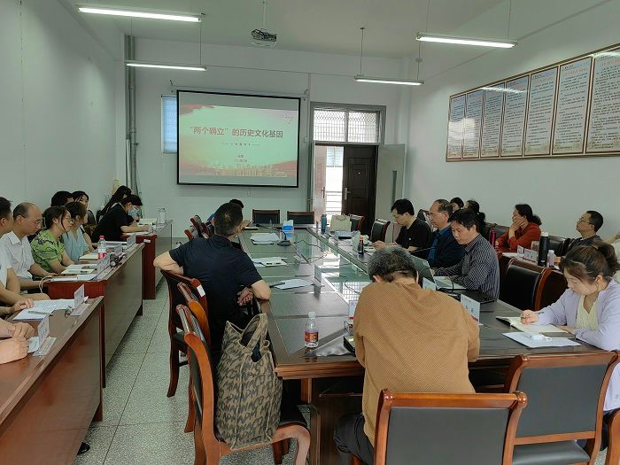 院党总支宣传委员、院长助理马荣以“‘两个确立’的历史文化基因”为主题,讲授了中国正在推进中华民族伟大复兴,正在迈向社会主义现代化强国,就必须对传统治理体制与治理思想进行符合中国特色社会主义方向的现代化改造,就必须确立习近平同志党中央的核心、全党的核心地位,确立习近平新时代中国特色社会主义思想的指导地位,汇集全党共识,凝聚全党力量,迎接具有新的历史特点的伟大斗争。