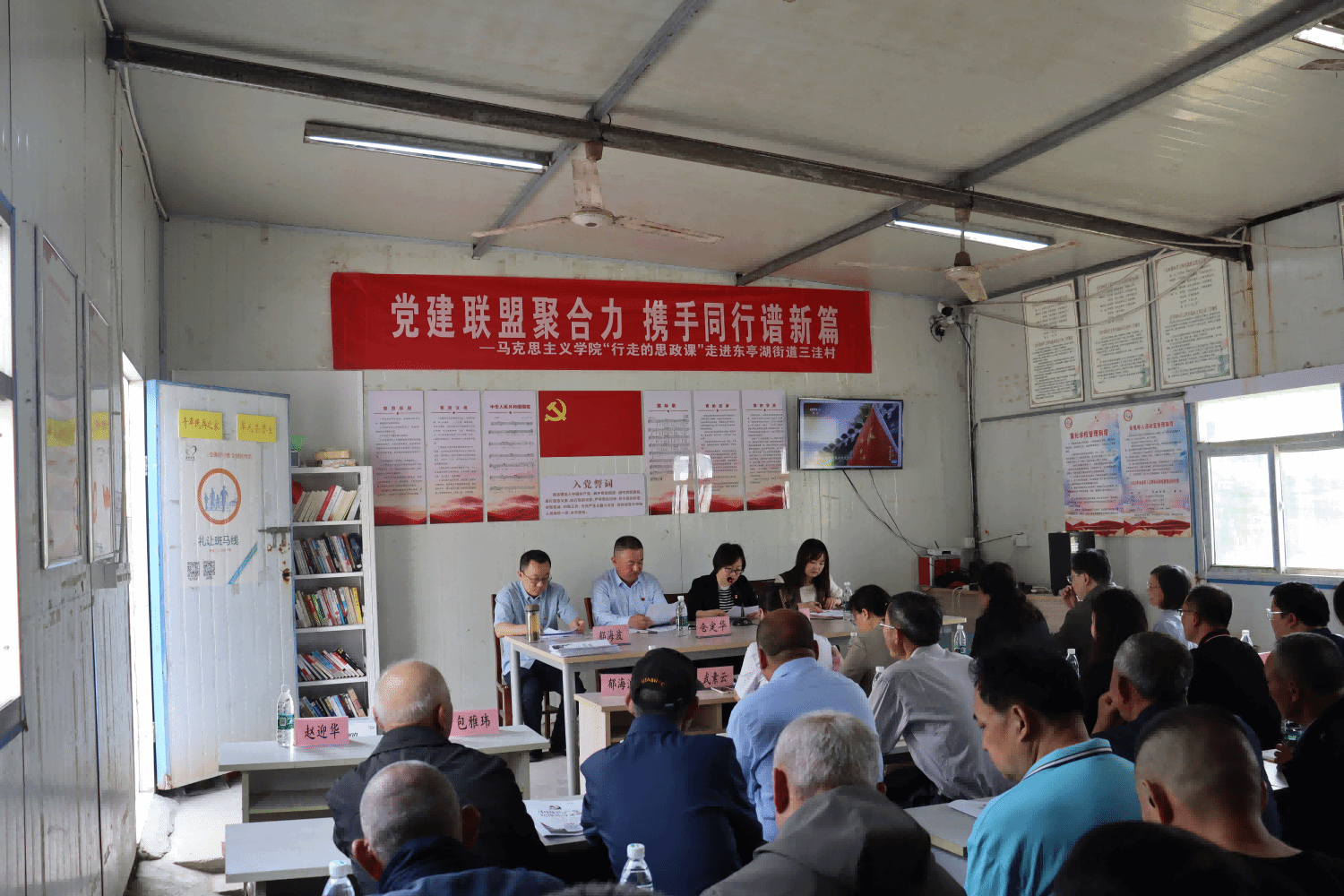 为深入学习贯彻党的二十大精神,进一步贯彻落实习近平总书记关于党的建设的重要思想,落实新时代党的建设总要求和新时代党的组织路线,5月20日上午,盐城工学院马克思主义学院一行14名党员教师走进盐城市亭湖区东亭湖街道三洼村开展“党建联盟聚合力 携手同行谱新篇”结对共建活动。三洼村党总支书记仓定华、副书记袁海勇出席了会议;马克思主义学院院长、党总支书记包雅玮、副院长赵迎华、教工二支部书记郁海波及部分党员同志参加了会议。会议由三洼村党总支书记仓定华主持。