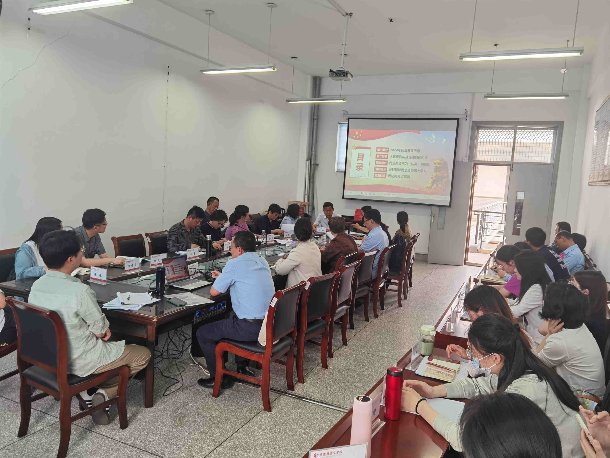 2024年5月,是我国第四个“民法典宣传月”,5月29日下午,德法教研部主任郁海波副教授在学院会议室作题为“‘典’亮美好生活”的民法典专题讲座。学院党总支书记、院长包雅玮主持,全体教职工参加。