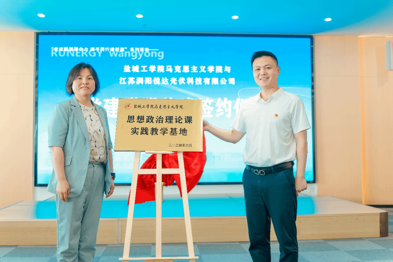 共建活动上,江苏润阳新能源科技股份有限公司财务部副经理、党支部书记徐晶与盐城工学院社科处处长、马克思主义学院党总支书记、院长包雅玮签订结对共建协议。随后,江苏润阳新能源科技股份有限公司行政副总监许可与盐城工学院党委常委、党委组织部部长邢晓平为“盐城工学院思想政治理论课实践教学基地”揭牌。与会人员还一同参观了润阳新能源三期及展览馆,“沉浸式”感受润阳新能源的发展历程、发展现状、发展前景。