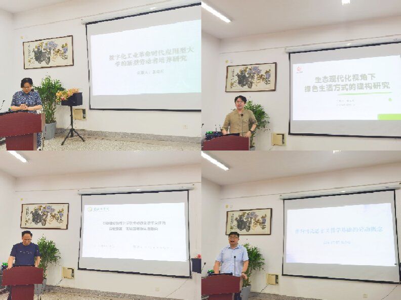 学术沙龙阶段,社科处处长包雅玮教授、马院王红梅教授担任点评专家。张瑞芹、蔡云晨、李宝、薛家豪四位老师分别结合自身当前研究相关领域的课题或论文,围绕数字化科技革命时代应用型大学的新型劳动者培养、生态现代化视角下绿色生活方式的建构、行动理论视域下学校劳动教育教学交往、作为马克思主义哲学基础的劳动概念等内容进行了学术分享。两位点评专家对分享内容进行了逐一点评,并给予了针对性的指导意见。
