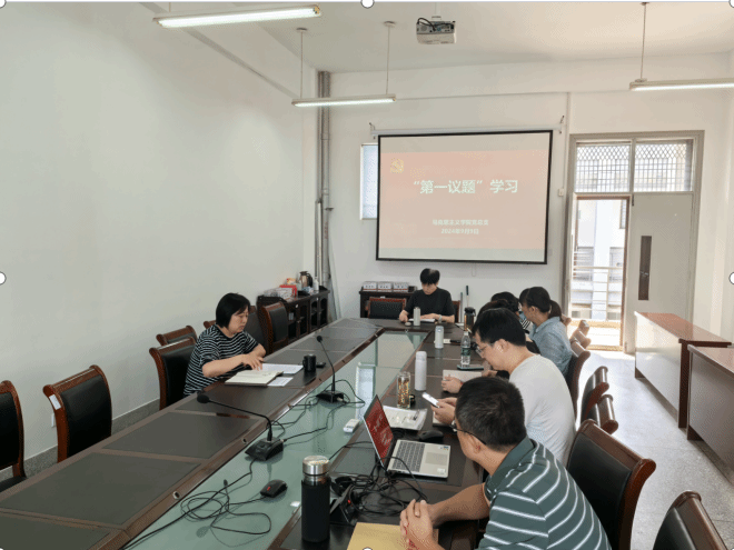 9月9日上午,在博学楼A514会议室,马克思主义学院党总支以“第一议题”形式学习习近平总书记关于党纪学习教育的重要指示精神和习近平总书记在《求是》杂志发表的重要文章《培养德智体美劳全面发展的社会主义建设者和接班人》。学院党总支书记、常务副院长胡凌霞主持,学院中心组成员参加。