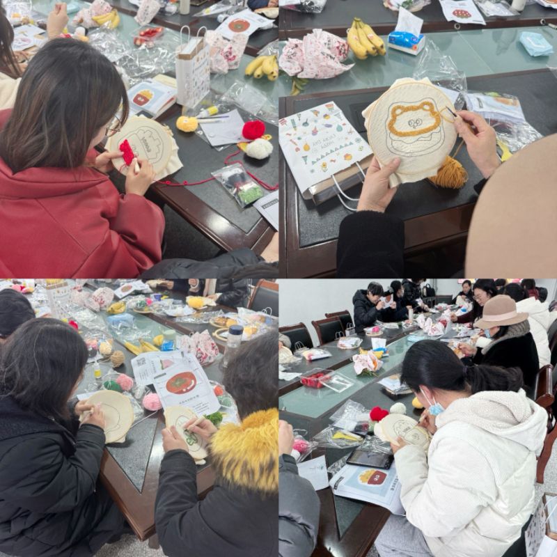 现场气氛热烈,大家欢聚一堂,学院分工会主席葛平向女教工致以节日祝福,并简要介绍活动安排。随后工作人员播放操作视频,讲解戳戳绣基础知识,包括工具使用、针法技巧等制作过程。女教工们陆续开始动手创作个人作品,大家认真‘绣’画,互帮互助,分享创作感受,欣赏创作成果。