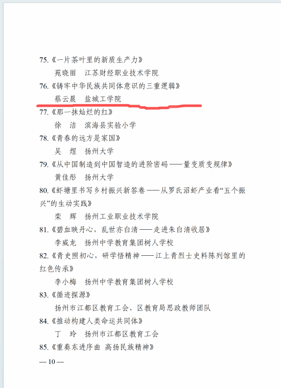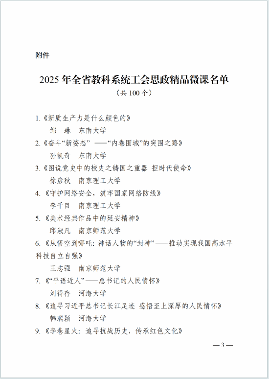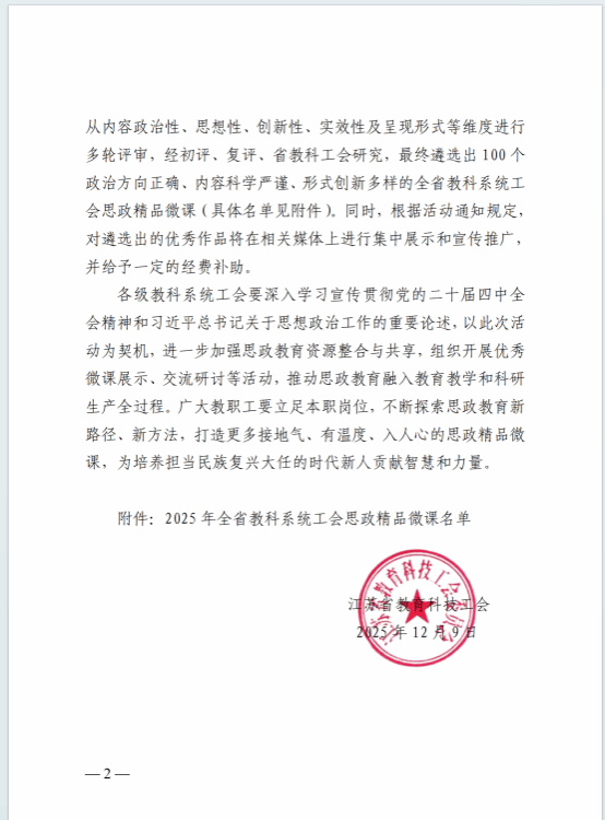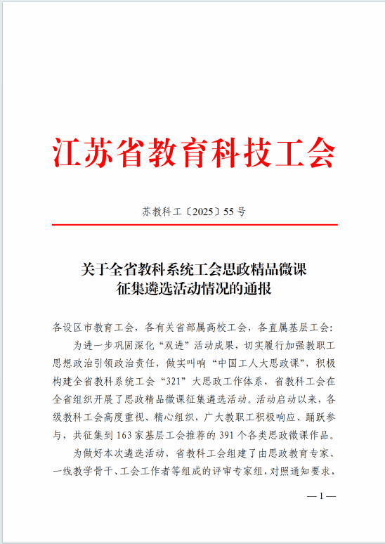 近日,江苏省教育科技工会公布2025年全省教科系统工会思政精品微课征集遴选结果(苏教科2025[55]号),我院蔡云晨老师的微课作品《铸牢中华民族共同体意识的三重逻辑》成功入选。