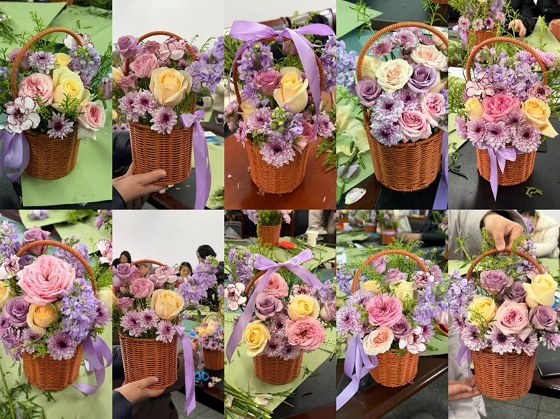 活动现场花香馥郁、暖意融融。学院特邀专业花艺师现场授课,围绕花材识别、花语寓意、色彩搭配、层次布局与修剪造型等内容进行细致讲解,并通过实操演示,深入浅出地传授插花技巧。老师们认真聆听、积极互动,在花艺师的悉心指导下,女教工们化身“花艺创作者”,精心挑选玫瑰、康乃馨、紫罗兰等花材,以巧手修剪枝丫、用心搭配造型,将零散花草组合成错落有致、独具匠心的花艺作品。